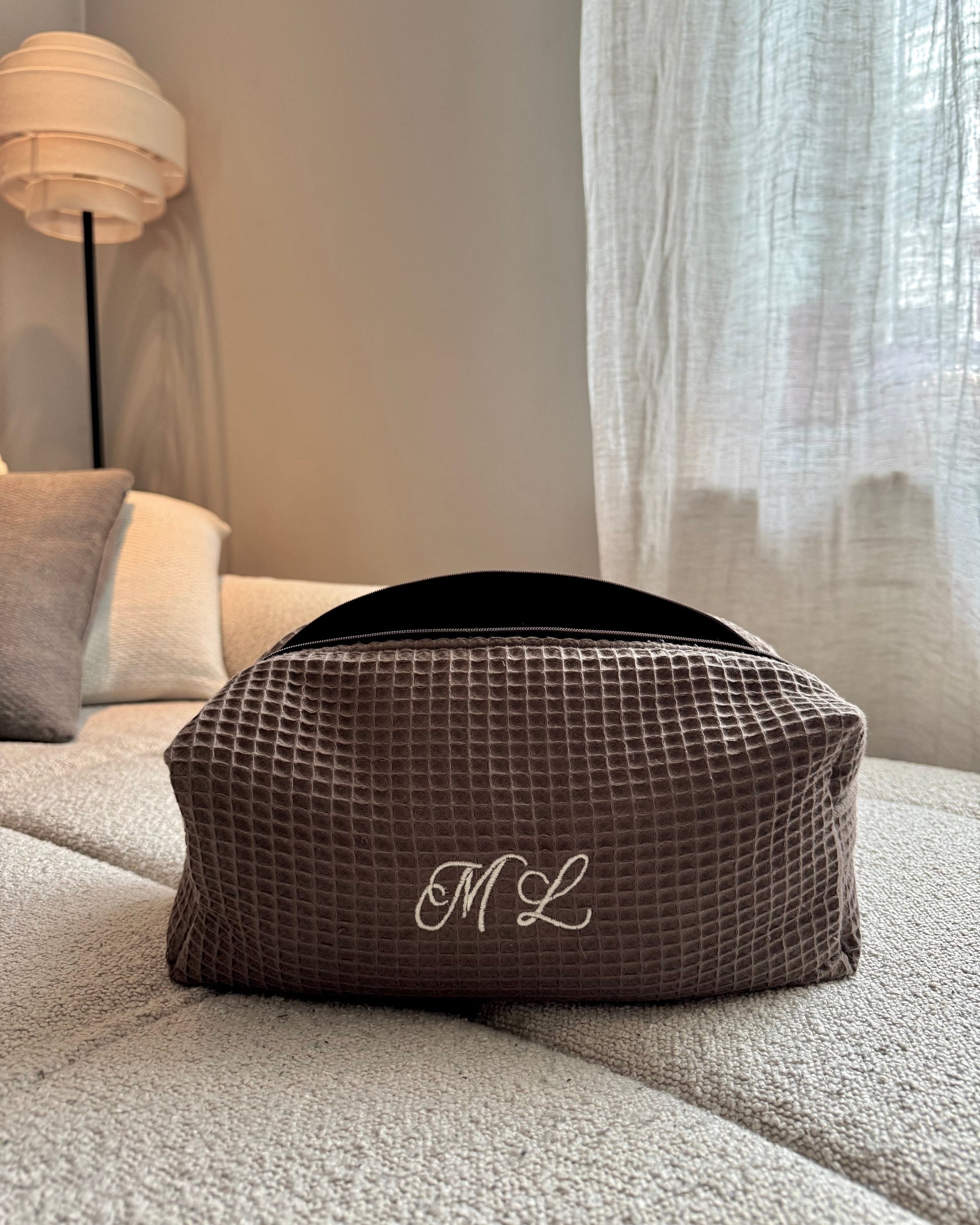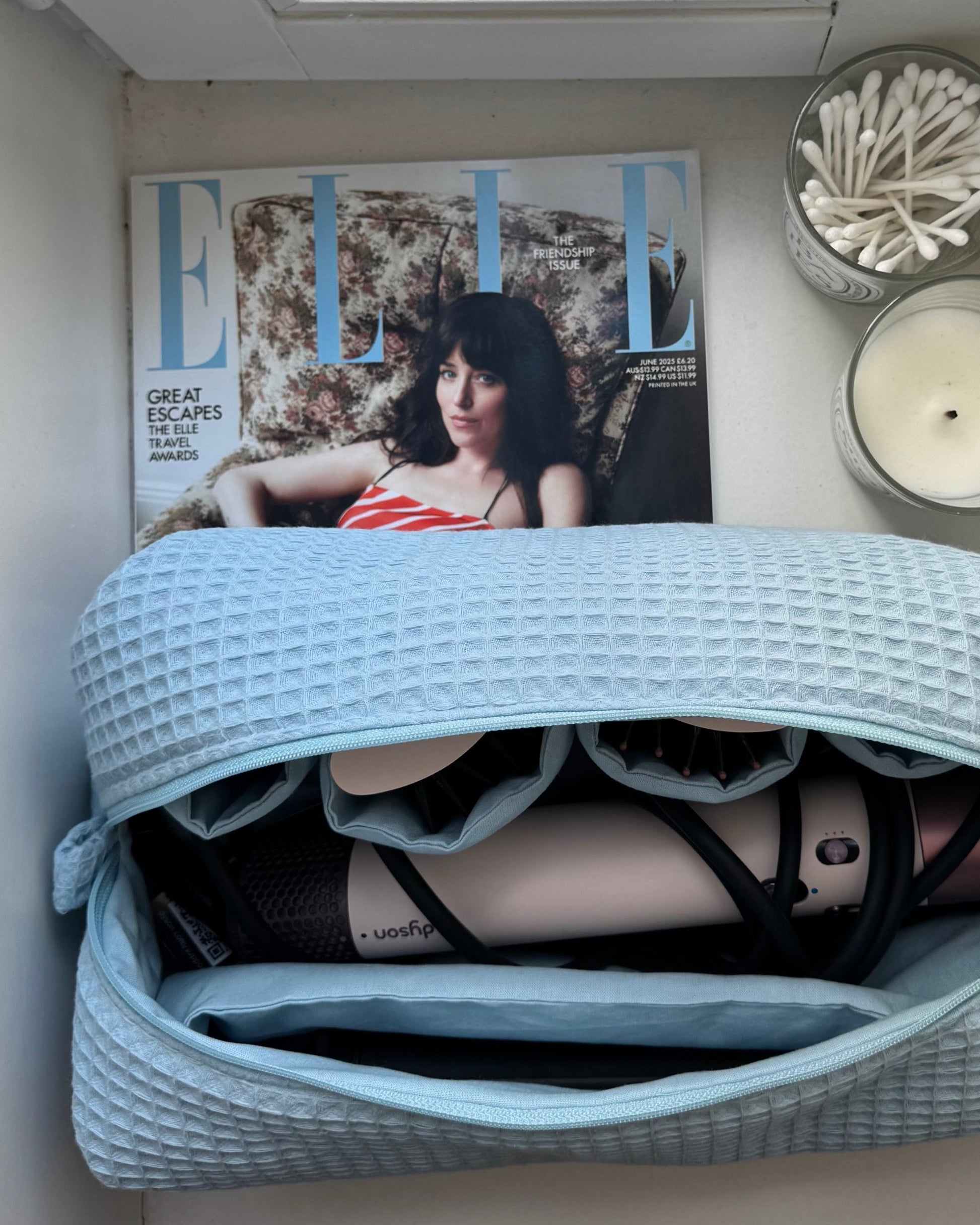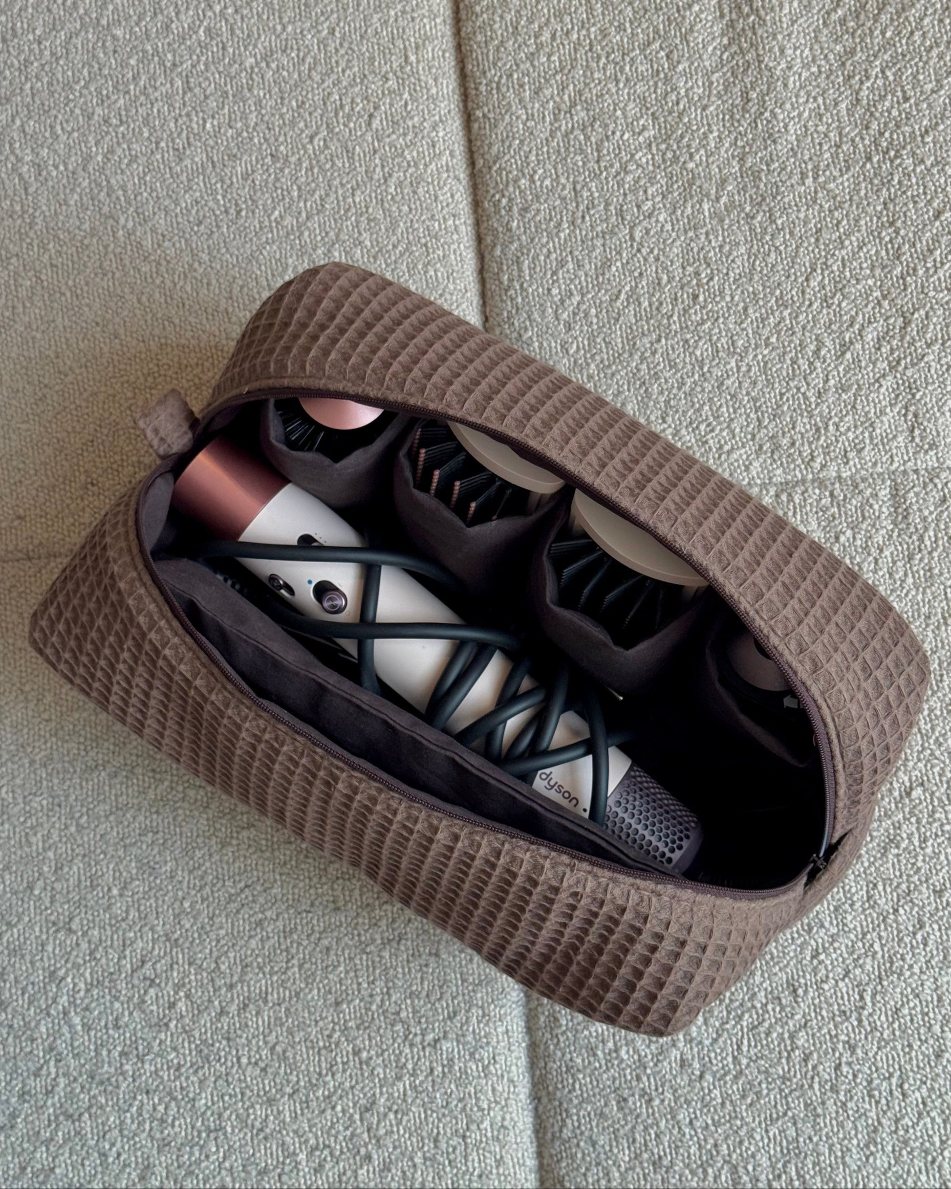 Hjemmesydd toalettmappe til Dyson Airwrap i vaffelstoff med broderte initialer eller navn. Toalettmappen har lommer på begge sider tilpasset de ulike tilbehørene.