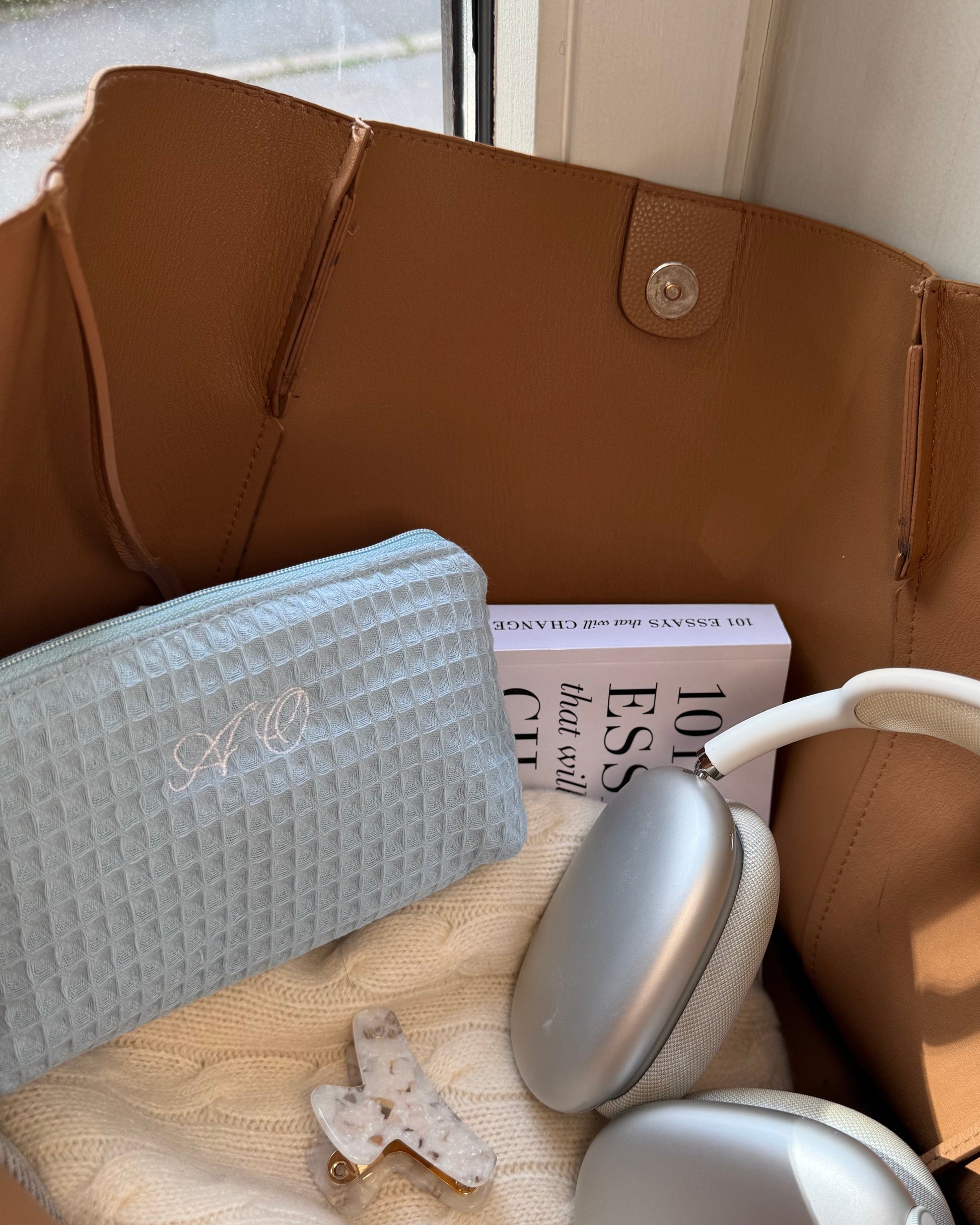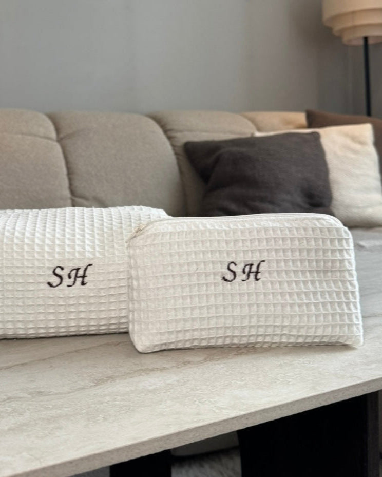 Hjemmesydd pouch i vaffelstoff med broderte initialer eller navn.